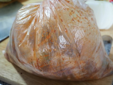 한 30분 알배추 절여뒀으면 물 빼내고 아까 잘라둔 야채 넣고 양냠장넣고 봉지 입구 막고 마구마두 흔들어줍니다.