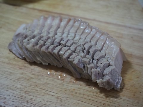 저는 두껍게 써는것도 좋아하지만 이번 고기는 기름이 적당히 붙어있어서 일부러 조금은 얇게 썰어줍니다.