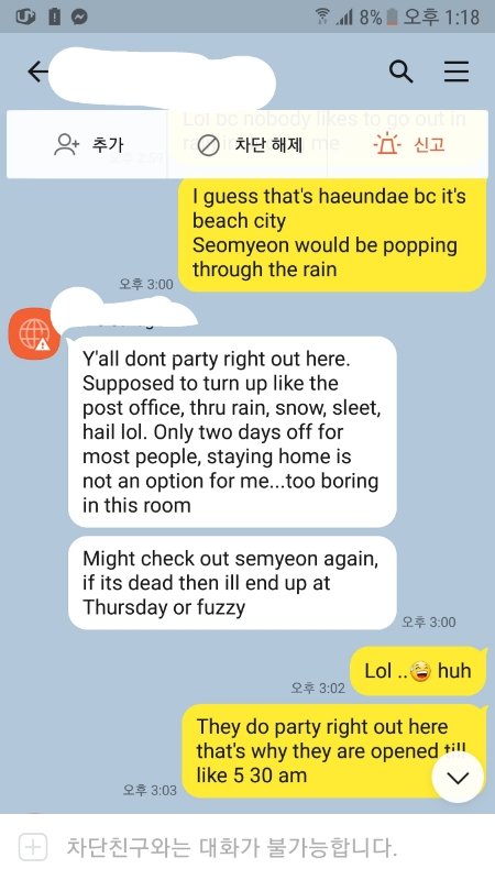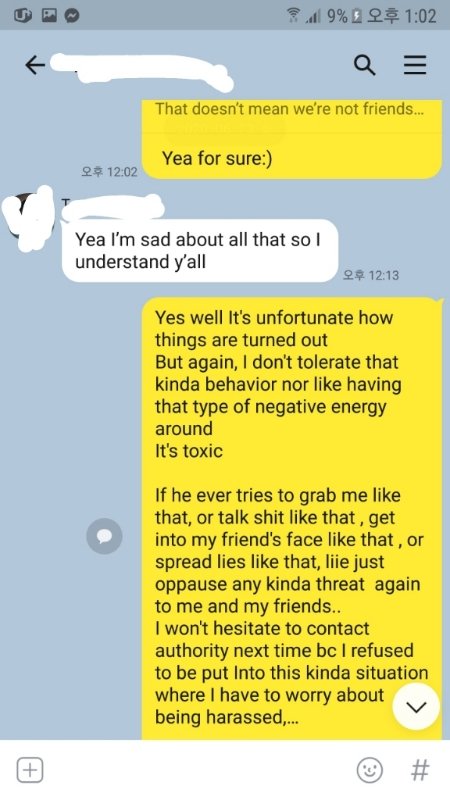 사실 JL이 문자 온걸 보여줘서 알고있었는데 우리가 빠에서 마주칠때마다 저한테 따로와서 말을 걸고 JL한테 따로가서 말 걸고 그걸 알고있었던 저는 원래 애초에도 관심이 없었지만 더 없어졌고 거기다가 JL에게 문자 남겨 "come sipping drinks with me in my hotel" 나랑 내 호텔에서 술마시러 오라고 (미군으로 국가에서 해줘서 리빙인호텔에서 살고있음) 라고 한걸 이미 봤기떔에 "어떻게 눈 하나 깜짝안하고 거짓말하나고 나 니가 걔한테 문자한거도 봤다고 거기다가 그런 일 아니라도 나는 너한테 관심이 없다 니가 여자들에 관해서 하는 말을 너는 되돌아 봐야한다 스스로 좀 자기 성찰을 해라"