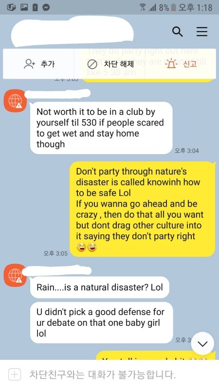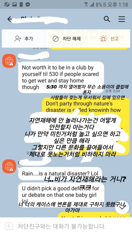 말을 바꾸며 아 너네 옆에 있던 O랑 S 를 Hoe(창녀, __) 라 부른건데 니네가 잘못 들은거..라고 하길래 이 남자애는 나를 그렇게 안부른다고 다른 여자를 그러헥 불러도 된다 생각하는건가 어이가 없어서 " 아니 걔네들은 그면 대체 왜 hoe냐고" 하니 "O는 더이상 not my boy T's girl anymore 더이상 자기 친구 T의 여자가 아니고 S는 자기랑 사겼었는데 사귈때 바람폈다고 자기한텐 친구들이랑 논다 해놓고 자기가 직접 봤는데 한국 남자들이랑 잔뜩 모여서 있었고 목에 키스마크가 있는걸 봤다 그래서 hoe라고 말했다" 길래 "아니 대체 니 친구 여자친구가 아니라고 hoe 라고 부르는 건 무슨 경우고 여기가 갱스터 존인지 아냐 그리고 너네 친군지 알았는데 아니었냐고 그리고 S는 그래 바람핀건 그렇다 쳐 근데 그렇다고 사람들 다 앞에서 그런걸 부르는게 괜찮다 생각하냐