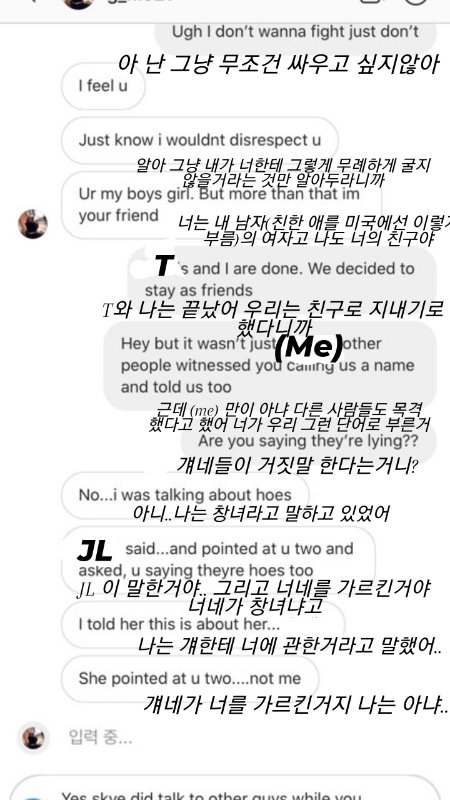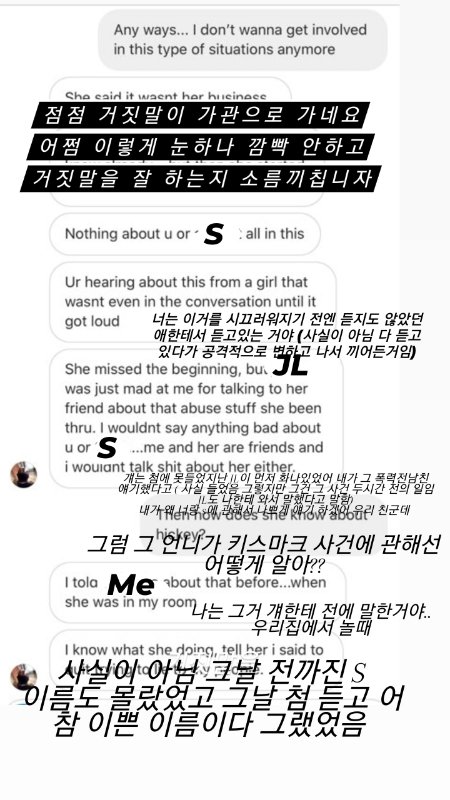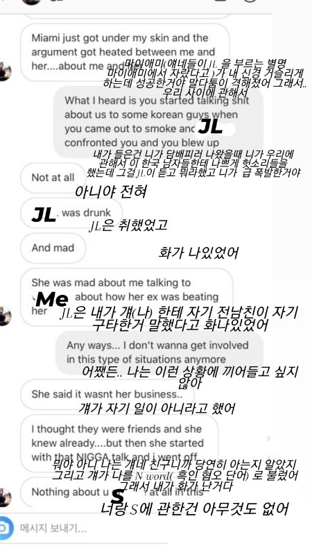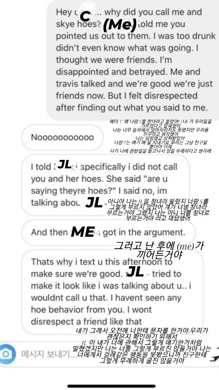 싸움은 JL 먼저 흑인 비하 단어를 써서 시작됐고 자기는 나랑 JL을 먼저 HOE 라고 불렀지 O랑 S를 hoe 라고 부른 적도 없으며 심지어 사람의 과거까지 들어 JL 전남친에게 맞았다(고 본인이 생각함 다리에 멍보고 그렇다는데 사실 다리에 멍이라면 누구라도 있음 심지어 나도 지금 있음) ..고 왜 맞았는지 뻔히 보이네 라며 심한 말도 서슴지 않았고 거기다가 나랑 JL를 악마들이라고 부르며 인신공격도 서슴치 않았습니다