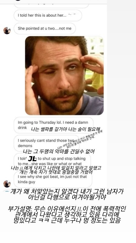 자기는 오히려 그런말 한적이 없다며 JL이 술 취해서 잘못들어서 그런거라고 니가 중간에서 끼어들어서 몰라서 하는 소리다며 하는 것이었습니다
