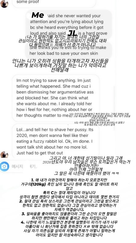 그래서 화가 난 저는 얘는 니가 생각하는 애보다 훨씬 나쁜애라고 너는 그런일을 당해놓고 어째 그렇게 현실을 못보냐고 내가 미쳤다고 걔랑 얘기하냐고 자기가 맨날 와서 얘기하는 거지 얘가 더러운 말하는거 스크린샷도 있다고 했더니 급 태도가 변하며 스크린샷 어디 나한테 다 보내봐하는 것이었습니다 그래서 어이가 없어 그래도 O와 C의 대화라 나머지는 빼고 JL과 내가 들어간 부분만 빼서 넣어서 보내줬더니 막 급 화를 내며 T의 번호를 달라고 했습니다