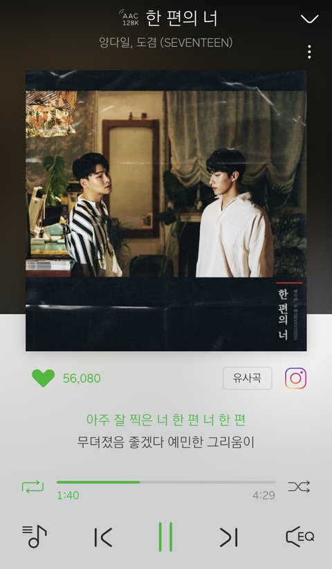 세븐틴 도겸이랑 양다일님이랑 부른 듀엣곡 진짜 너무 좋다 제목은 “한 편의 너”인데 둘이 목소리 합도 너무 좋고 그냥 노래 자체가 너무너무너무 좋아 여름이다 보니까 발라드 추천은 좀 그런 거 같아서 안 했었는데 오늘 같이 비 오는 날엔 들어보기 좋을 거 같아서!! 진짜 노래 너무 좋으니까 한 번씩만이라도 들어봐줘