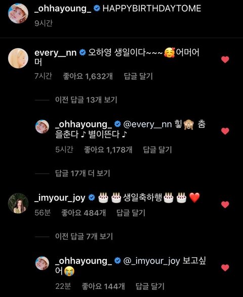 오늘(7/19) 하영이 생일!!!! 하영이 인스타에 예린이랑 조이가 댓글남겨줌 ㅠㅠㅠ