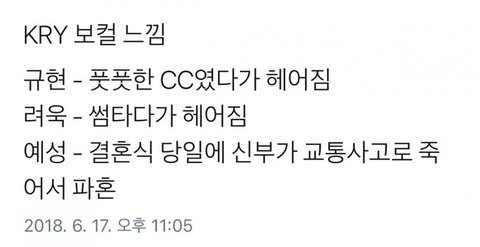 -여자아이들: 투메보체제임 민니 음색 개오지고 음역대도 다양함 브이앱에서 피아노 치면서 노래 부른것도 있어 그거 한번 들어봐 미연 비주얼 메보임 성량대박이고 목소리 개탄탄 그리고 브이앱에서 라이브로 노래불러준것도 있는데 개좋음 한번 듣고와봥 유튭에도 검색하면 나와