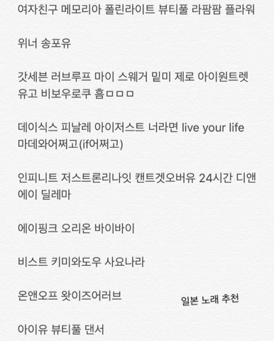 +++ 추천해준거 잘 듣고 있어! 너무 많아서 사진 붙였는데 화질 깨지려나...?