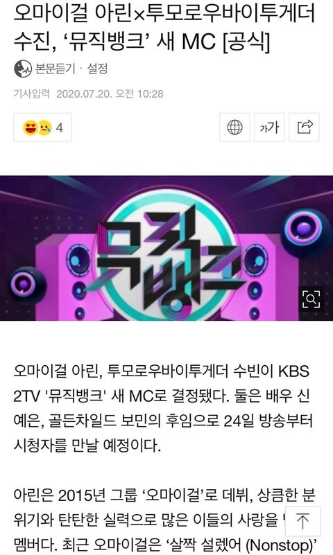 오마이걸 아린, 투모로우바이투게더 수빈이 KBS 2TV '뮤직뱅크' 새 MC로 결정됐다. 둘은 배우 신예은, 골든차일드 보민의 후임으로 24일 방송부터 시청자를 만날 예정이다.