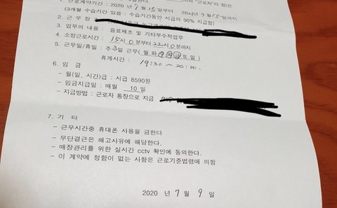 다른 지점에서 3년간 일을 하고 여기로 다시 취업하여 음료만들기는 수월하더군요. 하지만 베이스나 파우더 위치나 자잘한 업무방식이 다르다 보니 3년동안 같은 프렌차이즈에서 일을 했음에도 불구하고 익혀야 할 것들이 많았어요. 사장은 그런건 안중에도 없고 3년 경력만 보고 저를 쪼아 댔습니다. 교육과정에서도 첫날부터 '완전수박 레시피 뭔지도 모르냐?' '아이스크림 마감 하는 방법도 제대로 모르냐?' '지난 매장에서는 그런거 안해본것이냐?' 등등 새로운 곳에서 열심히 일하려는 제가 주눅들 수밖에 없는 말들을 했습니다. 물론 “일을 쉰지도 6개월 되었고 제가 모든걸 다 기억하지는 못한다”라고 말하긴 했습니다. 그리고 그저께 처음이자 마지막으로 이 지점에서 마감을 하게되었습니다. 혼자서 일을하다보니 모르는 것들은 사장님께 문자로 물어보기도 하고 "마감 메뉴얼"이 있기 때문에 시간대별로 할것들이 정리 되어 있어서 그것만 보고 메뉴얼 대로 마감을 진행했습니다. 그 메뉴얼에는 분명 "머신 끄기"라고 적혀져 있어서 커피 머신을 끄고 퇴근을 했습니다. 예전에 3년동안 일했던 다른 지점에서도 커피머신을 끄고 퇴근을 해서 아무런 의심없이 메뉴얼에 적힌대로 했습니다. 다음날 점심 쯤 사장에게 전화가 와서 머신을 왜 끄고 갔냐며, 아침에 장사를 못했다고 다짜고짜 화를 내는 겁니다. 죄송하긴 한데 저는 당연히 메뉴얼에 나와 있는 대로 마감을 진행했다고 억울함을 호소했지만 사장은 갑자기 너 같은 알바생은 처음이라며 그냥 죄송하다고만 했으면 한번 더 기회를 주려고 했는데, 말하는 방식이 맘에 안든다면서 더이상 같이 일을 못하겠다고 일방적인 해고통보를 해왔습니다. 저는 장문의 문자로 한번의 기회를 더 달라고 말을 했지만 답장은 오지 않고 그렇게 저는 해고 당했습니다. 근로계약서에는 내년까지 일 하기로 계약했는데 저는 여기에 들어온지 1주일도 되지않아 해고통보를 받아야했습니다. 근로계약서도 해고 당하고 문자로 겨우겨우 받아냈네요
