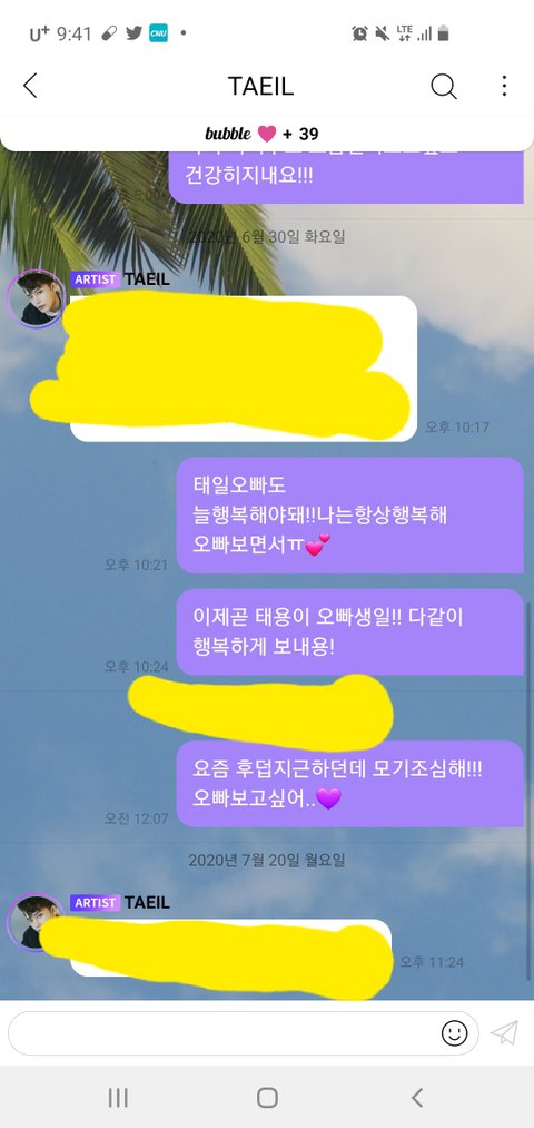 즈니들 나사실 어제 오후 1시에수술받고 너무아파서 정신못차리고 토하고 되게 힘들었었는데 오늘 조금 괜찮아져서 폰을 켰는데 태일이한테 버블이 와있었어ㅠㅜㅠㅠ 나어제 수술실 내려가기전에dreams come ture도 듣고 슈퍼휴먼도듣고 제발 잘됐으면좋겠다 빌었는데 태일이 너무감동이야ㅠㅠ 고마워태일아