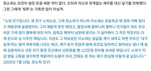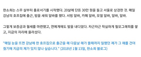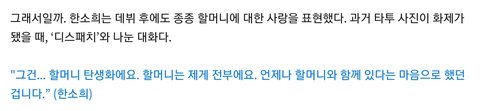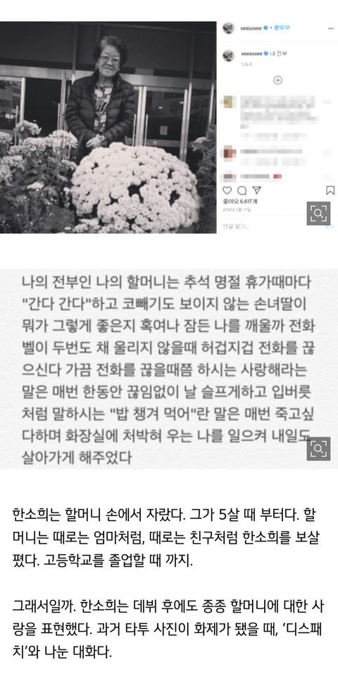 한소희 피팅모델 시절부터 너무 요정같이 매력 있게 생겨서 팬이었고 인스타로 디엠도 몇 번 보냈는데 답장으로 자기는 아무것도 아닌데 좋아해 줘서 고맙다고 갑자기 자기 엽사도 보내줬었고 ㅋㅋㅋㅋ또 그때 소희 님은 그림도 종종 그렸었는데 자기가 나중에 전시회 같은 거 하면 꼭 선물해 주고 싶다고 하고 건강하라고 디엠도 보내줬었음.. 그 당시에 과감하게 타투들도 있었고 (물론 할머니 탄생화였던 것도 알고 있었지만) 그냥 겉모습만 봤을 때는 모르는 누군가가 보면 다소 삐딱하게 보거나 노는 애처럼만 비쳤을지 모르지만 정말로 소신 있어서 멋있었고 따뜻한 마음을 가진 사람임 작은 하나하나에도 엄청 감사해할 줄도 알고 너무 착한., 그래서 늘 한결같이 응원 중인데 예전 타투랑 담배 사진 가지고 한참 사람들이 욕하고 또 이번 일도 이렇게 밝혀지는 거 보면서 안타까웠는데 그때마다 대처하는 모든 방식들이 예전과 같이 변함이 없는 한소희 그 자체에다가 솔직하고 진중하고 소신 있어서 더 좋아하게 됨 ㅎㅎ