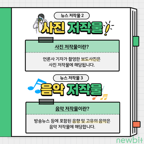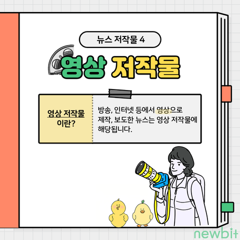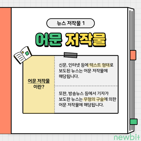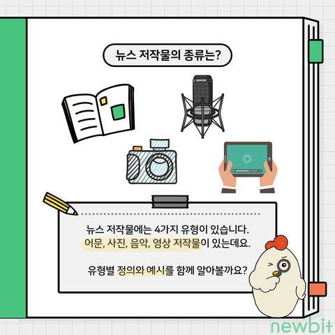 뉴스 저작물에는 어문·사진·음악·영상 저작물 이렇게 4가지 유형이 있습니다!!