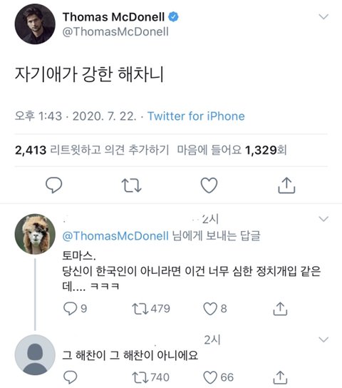 개웃기닼ㅋㅋㅋㄱㅋㅋㄱㅋㄲ 저 외국인분 트윗에서 뜻 몰라도 이쁜 한국어 쓰시는 배우분이신뎈ㅋㅋㅋㅋㅋ갑자기 해차니 나온 것도 웃기고 밑에 정치얘기하는 거도 웃기고 그 해찬이 아니라는 거도 ㅈㄴ웃김ㅋㅋㅋㅋㄱㅋㅋㄲ