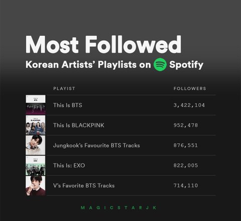 정국이가 본업존잘이라 다양한 음악에 관심 많은 건 유명하고 그래서 스포티파이 아티스트 플레이리스트 팔로워 3위인 건 알고 있니? 앞에 둘은 그룹이란 점에서 솔로 중엔 정국이가 제일 높네 얼마나 정병 올지 이해해