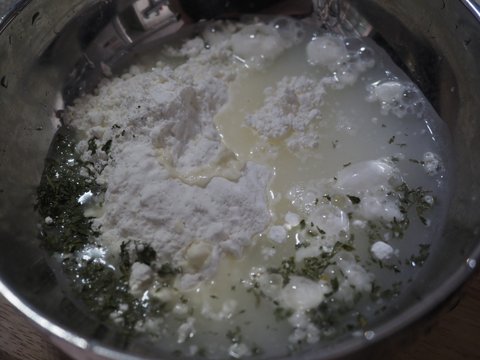 그 사이 전분 1 튀김가루 1 물 1 비율로 튀김옷 만들어두고(색상을 위해 파슬리 첨가)