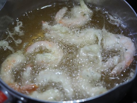 기름은 온도를 올려서 튀김옷 한방울 떨어뜨렸을때 바로 올라올 정도로 해두고