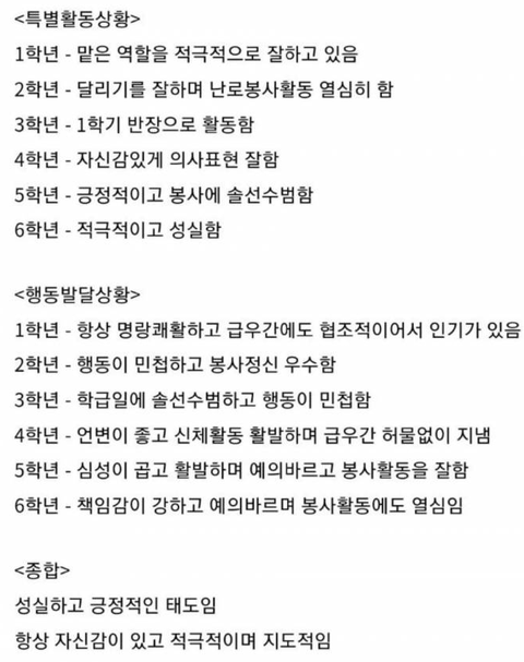 이해판단력이 우수하며 행동이 민첩하여 체육기능 돋보이는 등 전교과 성적이 우수한 편임