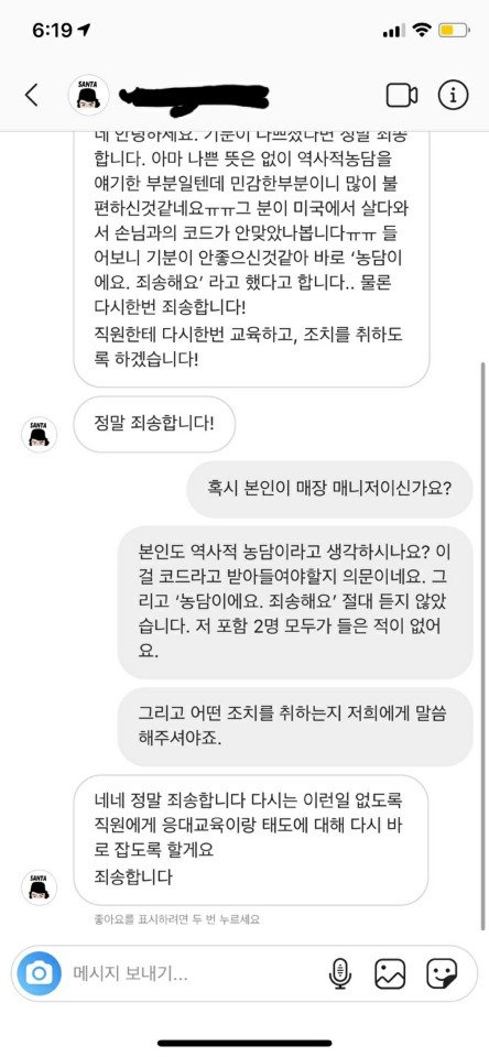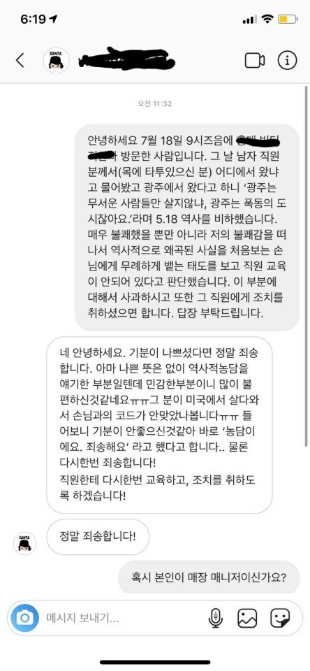 해당직원이 아닌 매장 매니저의 사과를 받았지만 '역사적인 농담'이나 '코드가 안맞았다'는 단어선택을 보며 더 이상의 사과는 의미가 없다고 생각했습니다. 5.18 민주화운동을 폭동이라고 칭한 것을 홍대의 한 매장에서는 ‘농담’이라고 생각하고 있었습니다. 담당매니저가 해당 직원에게 내린 조치는 역사교육이 아닌 응대교육이기 때문에 해당 직원은 여전히 왜곡된 역사관을 가지고 있을거라는 생각을 배재하기는 어렵습니다.
