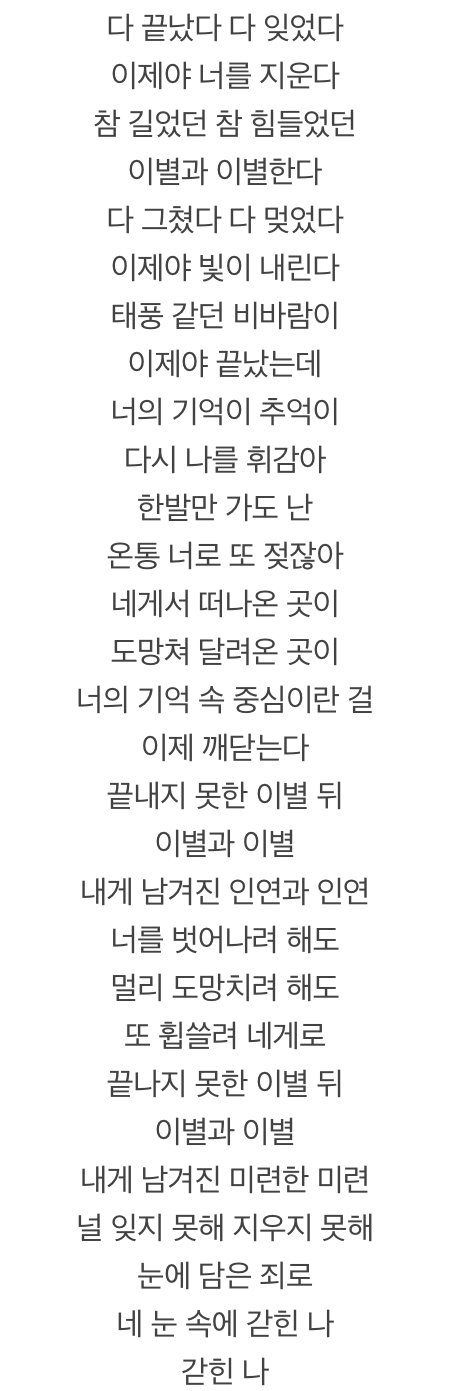 다 잊었다고 생각했는데 알고보니 난 태풍의 중심이었고 조금만 움직여도 너가 날 휘감는다. 결국 널 잊지 못했다.