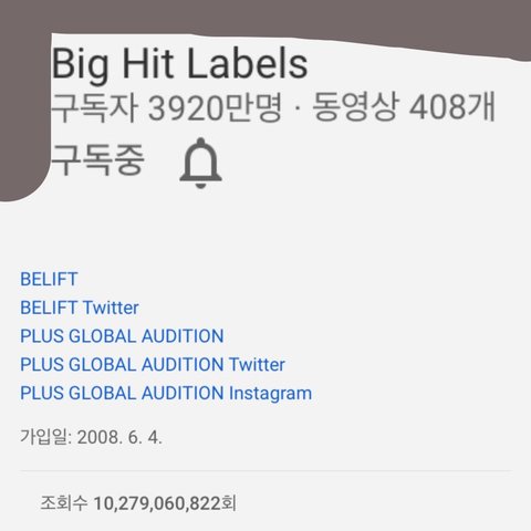 구독자 3920만명 업로드 영상 408개 누적조회수 102억