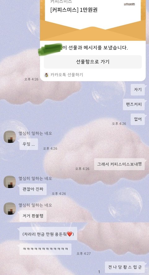 더운날씨에 고생하겠다싶어 커피 기프티콘을 보내줬습니다 그런데 정말 괜찮으니 환불하고 돈으로 달라네요.. 돈으로 주나 기프티콘으로 주나 얼마안돼는 돈이고 충분히 해줄수 있지만 저렇게 직접적으로 요구하니 저를 물주로 보나 싶어 기분이 나쁘네요.. 제가 예민한걸까요? 다른 커플들도 저렇게 차라리 돈으로 돌라고 얘기하는 경우가 있나요?