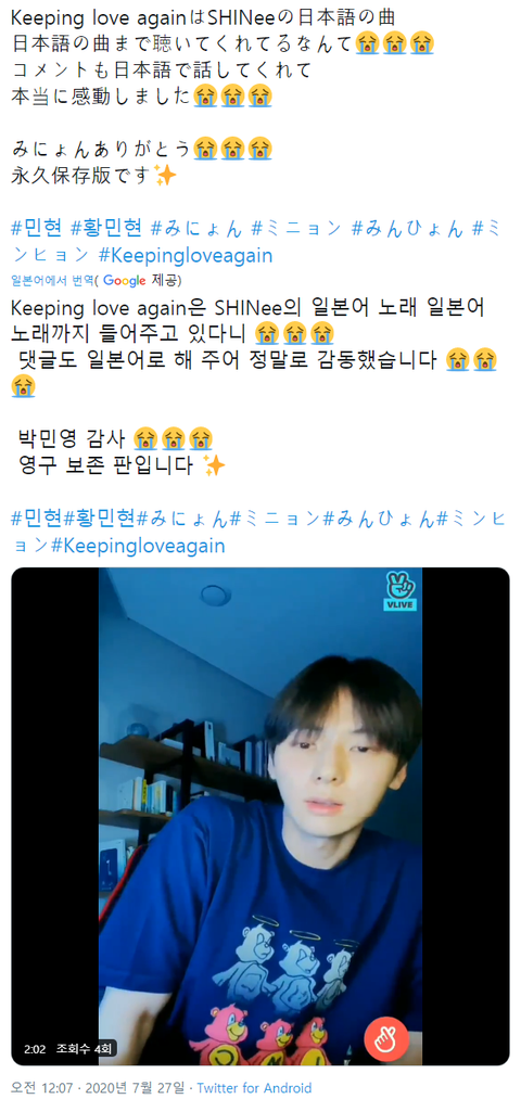 오늘 브이앱에서 샤이니의 일본싱글 수록곡 키핑 러브 어게인 언급