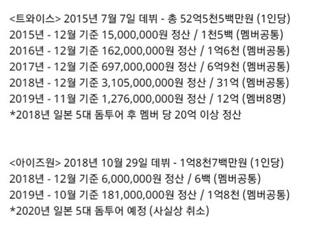 1위 블랙핑크 : 각 멤버 당 61억 2위 트와이스 : 각 멤버 당 57억 3위 레드벨벳 : 각 멤버 당 34억 4위 마마무 : 각 멤버 당 23억 5위 아이즈원 : 각 멤버 당 2억