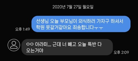 나 오늘 시험끝났는데 학원쌤이 정규수업 오라고 그랬거든...? 다른학교애들은 이미 끝났다고 긍데 내가 못가겠다고 저렇게 보냈거든?? 근데 오라고 눈치주는데 뭐라 답장하냐... 오늘 죽어도 가기싫은데