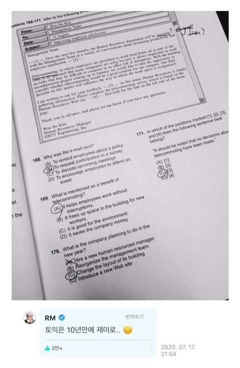토익을....재미로 공부하는 남자...그것도 10년만에....하다하다 시험까지 마스터하는 남자...알엠은 ㄹㅇ 찐이다 와ㅋㅋㅋㅋㅋ