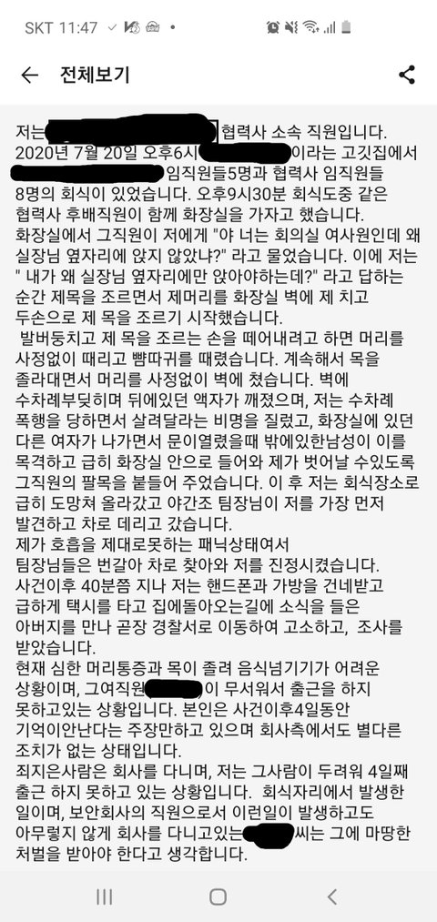 친구는 지금 병원을 돌아다니며 검사를 받고 있고 머리를 너무 많이 부딪혀 내일은 ct를 찍으로 간다고 합니다. 정형외과는 3군데나 돌아 다녔구요 정신적 스트레스로 인해 밥도 못먹고 무서워서 회사에도 못나가고 있으며 하루하루 눈물만 흘리고 있습니다. 친구가 원체 할말 잘 못하는데다가 대기업 협력업체라 괜히 이일이 커지면 명예회손이라던가 보복을 당할 까봐 하루하루 무서워 하고 있습니다.
