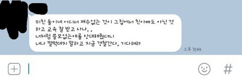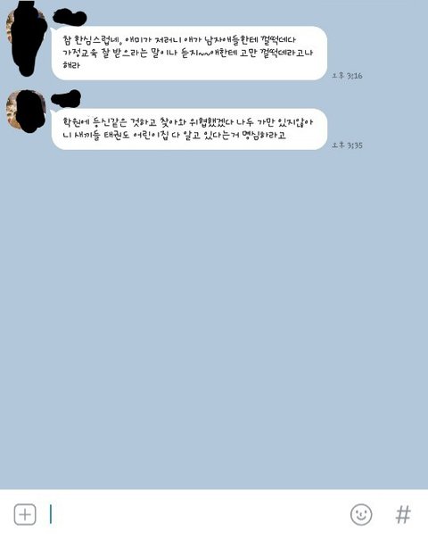 그리고 20분후 또 다시 B엄마가 A에게 등신같은거랑 학원와서 자기아들 위협했다며 자기도 A랑 A동생이 다니는 어린이집 태권도학원 알고있다며 가만있지않겠다고 카톡보낸거임.