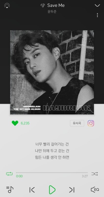 아까 자다 깨서 잠이 안 와서 노래나 들을까 하고 음원 사이트를 들어갔는데 내가 장르 종류 별로 가리지 않고 다 듣거든 근데 윤두준이 신곡을 냈더라고 옛날부터 윤두준 드라마에서 많이 보긴 했는데 노래라니 의아해서 들어보자 하고 수록곡4개? 까지 다 들어 봤는데 아니.. 타이틀 곡도 좋긴한데 수록곡에 save me 라고 있거든 ? 야 그거 뭐야..? 나 듣고 깜짝 놀랐어.. 아무 생각 없이 듣다가 갑자기 귀에 딱 꽂히는 비트가 들리길래 뭐지 하고 제목 봤는데 너무 놀랐어
