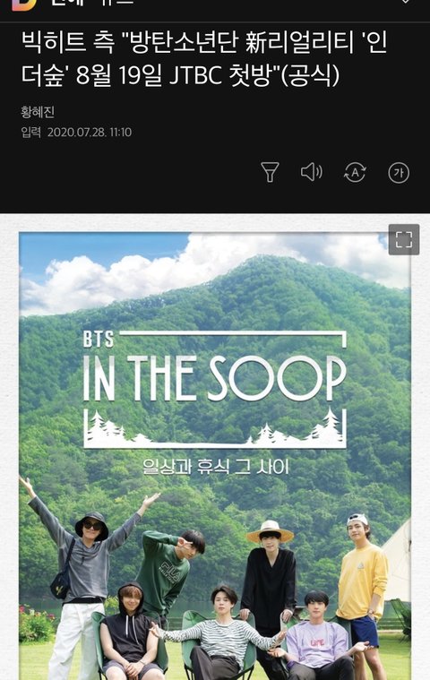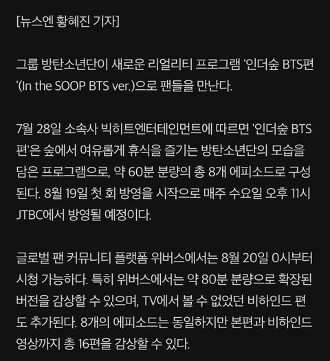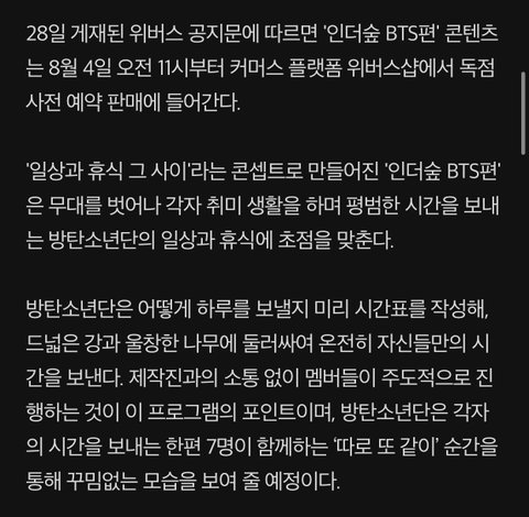 방탄소년단은 어떻게 하루를 보낼지 미리 시간표를 작성해, 드넓은 강과 울창한 나무에 둘러싸여 온전히 자신들만의 시간을 보낸다. 제작진과의 소통 없이 멤버들이 주도적으로 진행하는 것이 이 프로그램의 포인트이며, 방탄소년단은 각자의 시간을 보내는 한편 7명이 함께하는 ‘따로 또 같이’ 순간을 통해 꾸밈없는 모습을 보여 줄 예정이다.