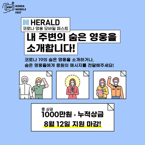 대한민국을 대표할 누적상금 기반의 온라인•모바일 영상제 코리아 모바일 페스트(KMF)의 출범과 함께 헤럴드에서 주최하는 두 번째 영상 공모전 ‘코로나 영웅 모바일 페스트’를 소개합니다!