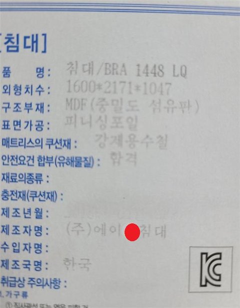 침대 한켠에는 품명, 치수, 안전요건합격유무, 제조년월, 제조자명, 제조국명 등이 써있는 스티커가 붙어있는데 제조년월을 알아볼 수 없고, 이 부분은 방문했던 기사도 인정함(사진참고)도 이야기 하며