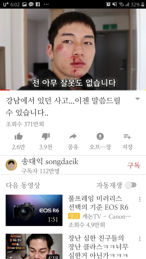 송대익 유튜브에 이런 영상이 있더라구요. 저 영상 내용은 송대익이 클럽 페이스에 가서 가드분들이 잘못도없는 자기를 억지로 끌고나왔다. 그리고 혼자 콘크리트 바닥에 넘어져서 쓸려서 저렇게됐다. 이런내용인데... 이상한게 설령 넘어져서 상처가 생긴거라해도 피도 안닦고 연고바르거나 치료하지도않고 잠을잤다는게 말이안되네요. 그리고 얼굴에 상처는 있는데 붓기가 하나도 없어요.( 솔직히 누가봐도 분장한 거 티나지만...) 또 가드가 난동일으키지도않은 사람을 쫓아낼 일도 없고...