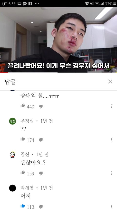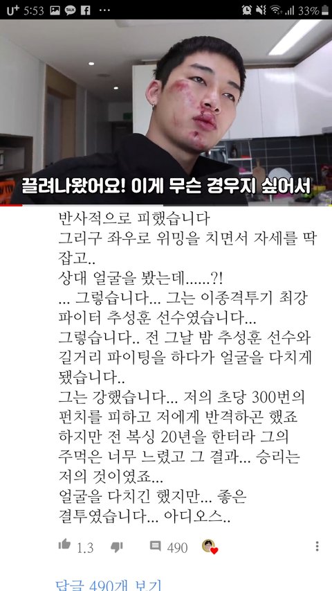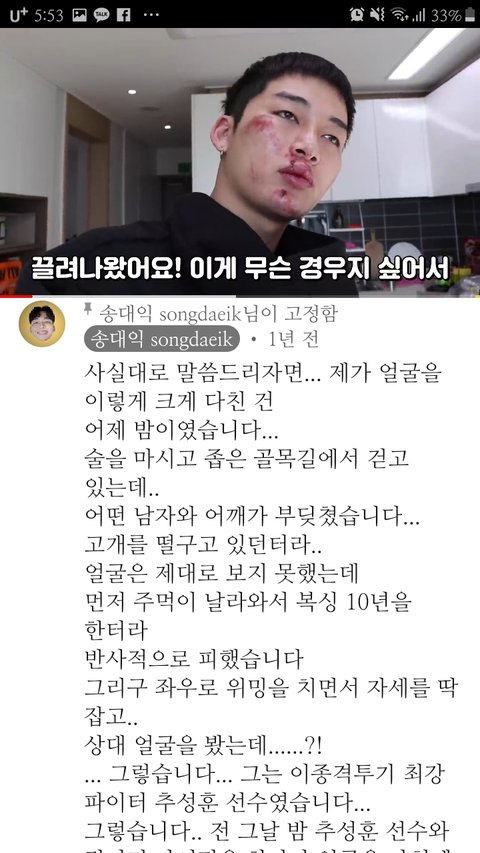 댓글창도 가관이더군요. 송대익이 쓴 댓글을 보면 길가다가 추성훈 선수와 어깨를 부딪혀서 추성훈 선수에게서 주먹이 날라왔고 복싱 20년을 한 자기는 그걸 피하고 이겼고 좋은 결투였다 뭐 이런내용인데... 이건 하나부터 열까지 누가봐도 구라다... 이걸 믿는 잼민이들은 헐 진짜요? 힘내요 ㅇㅈㄹ 추성훈 선수한테 명예훼손으로 고소당해도 할말없음ㅋㅋㅋ 추성훈이 미쳤다고 길가던 사람 패겠냐ㅋㅋㅋㅋㅋ