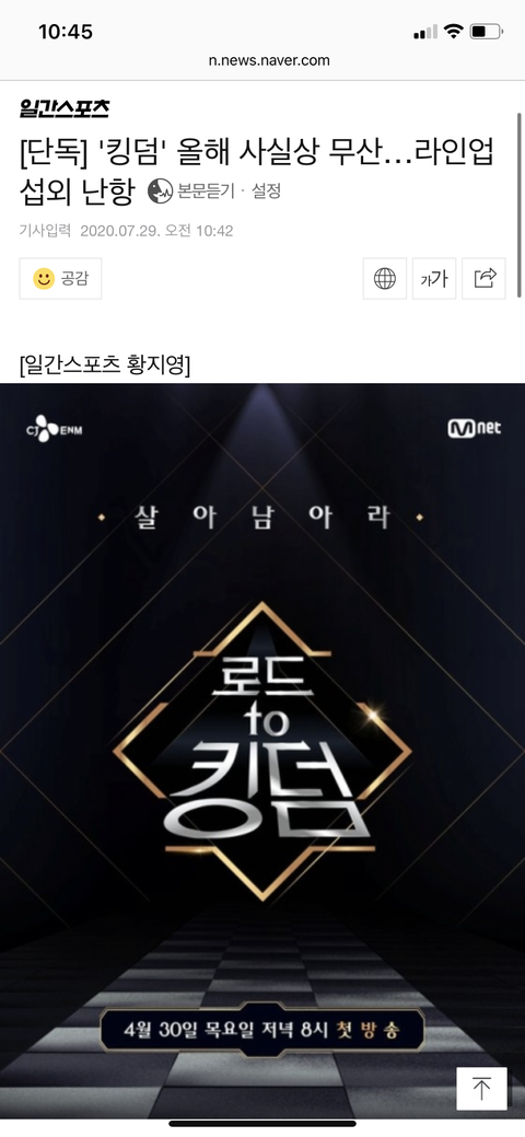 https://n.news.naver.com/entertain/article/241/0003041776 킹덤 무산 ㅋㅋㅋㅋㅋ 제목으로 세븐틴 엔시티로 어그로 끌더니 무산 ㅋㅋㅋㅋ