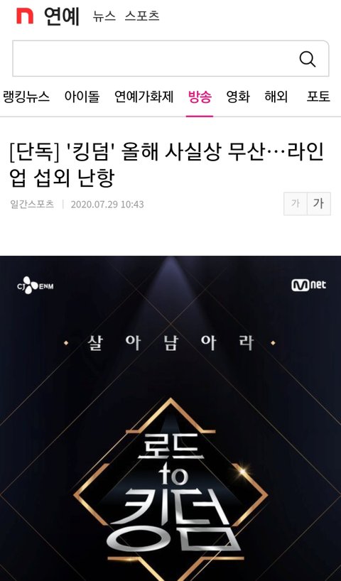 [속보]엠넷 킹덤, 섭외난항으로 무산…