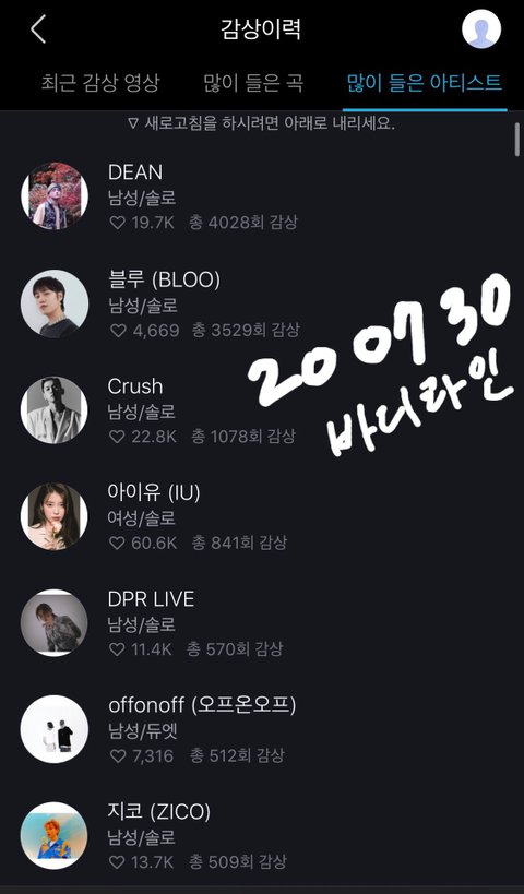 진짜 아이돌 잘 모르는데 딱히 인증할 게 없어서 가장 많이 들은 아티스트 던지고 갈게 ㅋㅋ