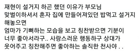 살림아직 안나와서 잘 모르겠는데 설거지도 자기가 하고 과일도 유일하게 숙소이모님대신 깎아먹는다하고 방도 항상 깨끗함 깔끔할듯
