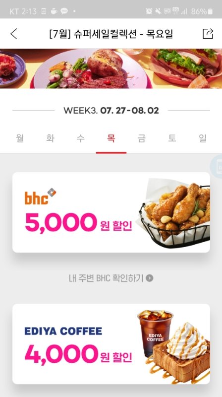 오늘 요기요에서 bhc 5천원 할인함