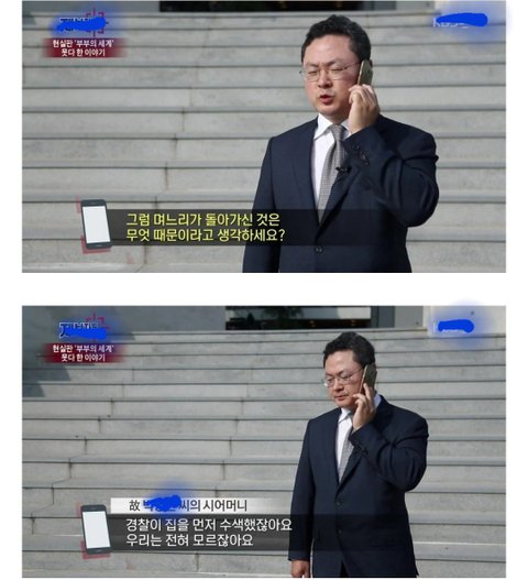 사건 현장을 왜그렇게 급하게 치우셨나요? 시어머니 되시는분 대답좀 해보세요. 경찰분이 다 치우셨다는 그런