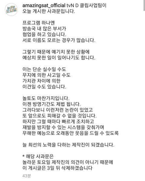 그냥 '다른부서에서 일으킨 문제이지만 제대로 확인하지 못해서 죄송하다' 이렇게만 썼어도 그냥 그래...ㅋ 이러고 넘어갔을 일이었을텐데.. 그리고 3일 뒤에 삭제하겠습니다....ㅋㅋㅋ 할많하않