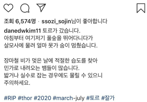 그 강아지가 살모사에 물려서 무지개 다리를 건넜다고 해 ㅠㅠㅠㅠ
