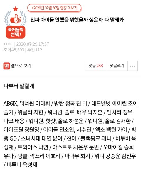 알못아 우리 팬덤이 판에 있긴 한데 작아서 댓글 추천다누르고 가는거임 ㅋㅋㅋㅋ 팬덤 큰편이야제발무시그만좀!! 한달전에는 몰라도 지금은 알바없다는거알지않아?