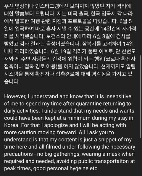 7. 사람들은 코로나 인데 코로나로 난리인 미국에서 한국에 왔고, 자가격리 끝나자마자 돌아다녔다고 문제를 재기함.