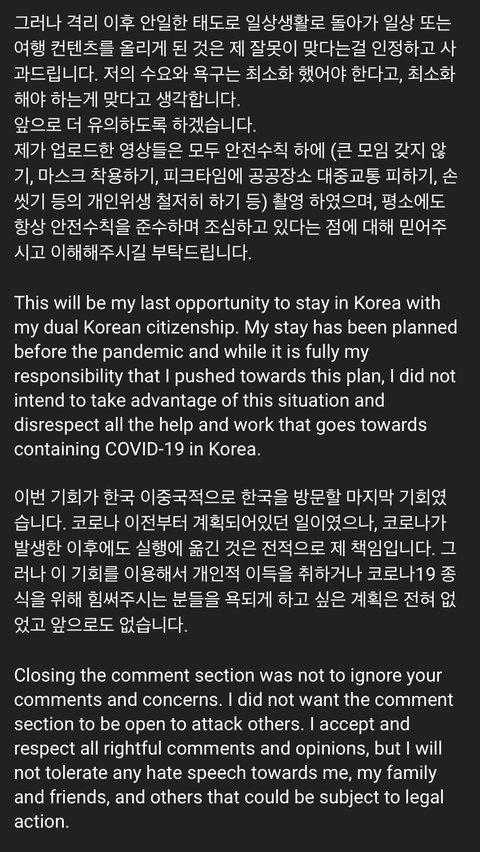 그리고 그 영상에는 한국 방문 브이로그에 대한 피드백이 없었음.