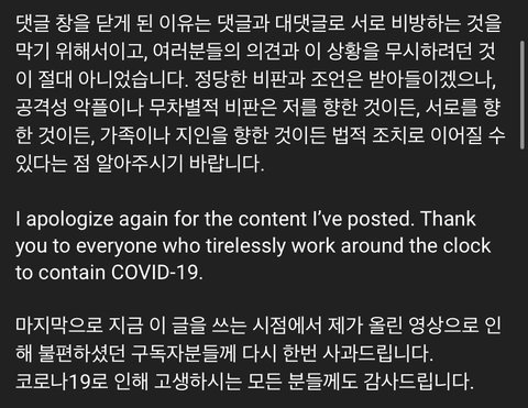 댓글 창을 막은 이유는 서로 비방하는 것을 막기 위함이며, 적당한 비판이나 조언은 받지만 공격성 악플이나 무차별적 비판은 법정대응 하겠음.