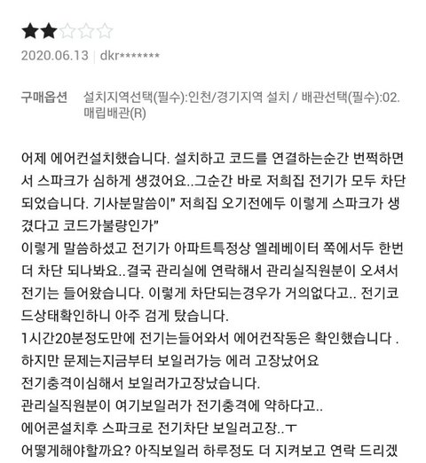 이 상황 어떻게 해결해야할까요..? 에어컨 설치 당시에 스파크가 나면서 냉장고, 와이파이, 보일러 모두 먹통이 되고 관리사무실 직원분의 도움으로 1시간 반 넘게 지난 후 고쳐졌지만 보일러는 이틀이 지나고 나서야 정상가동이 되었습니다.